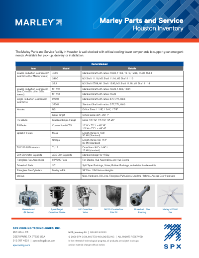 The Marley Parts and Service facility in Houston is well stocked with critical cooling tower components to support your emergent needs. Available for pick-up, delivery or installation.Available Document Languages
