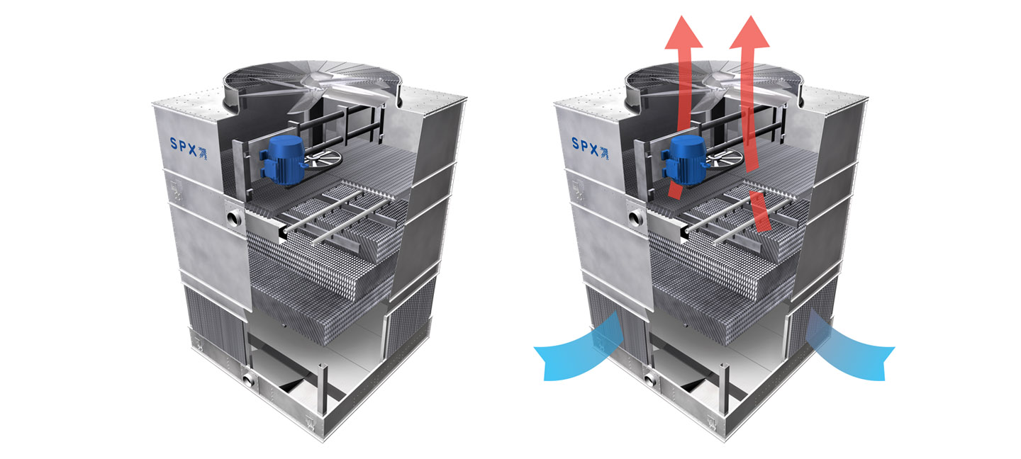 Induced-draft counterflow cooling tower design requires less plan area than crossflow cooling towers for many HVAC and light industrial duties. And because the cooling tower’s size typically results in less steel used, its reduced weight requires less support structure.