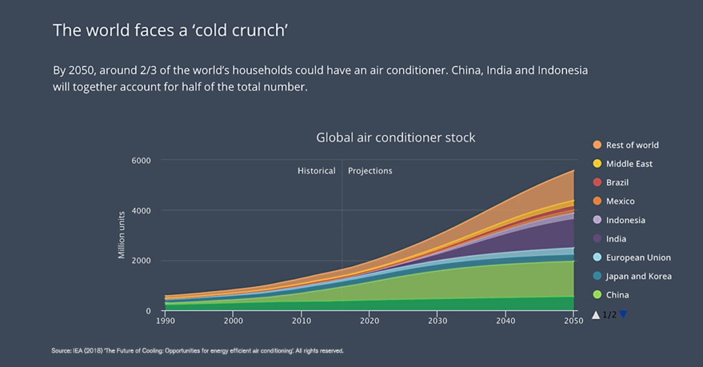 The International Energy Agency (IEA) predicts that the number of air conditioners in buildings will triple from 1.6 billion today to a mind-boggling 5.6 billion by 2050.